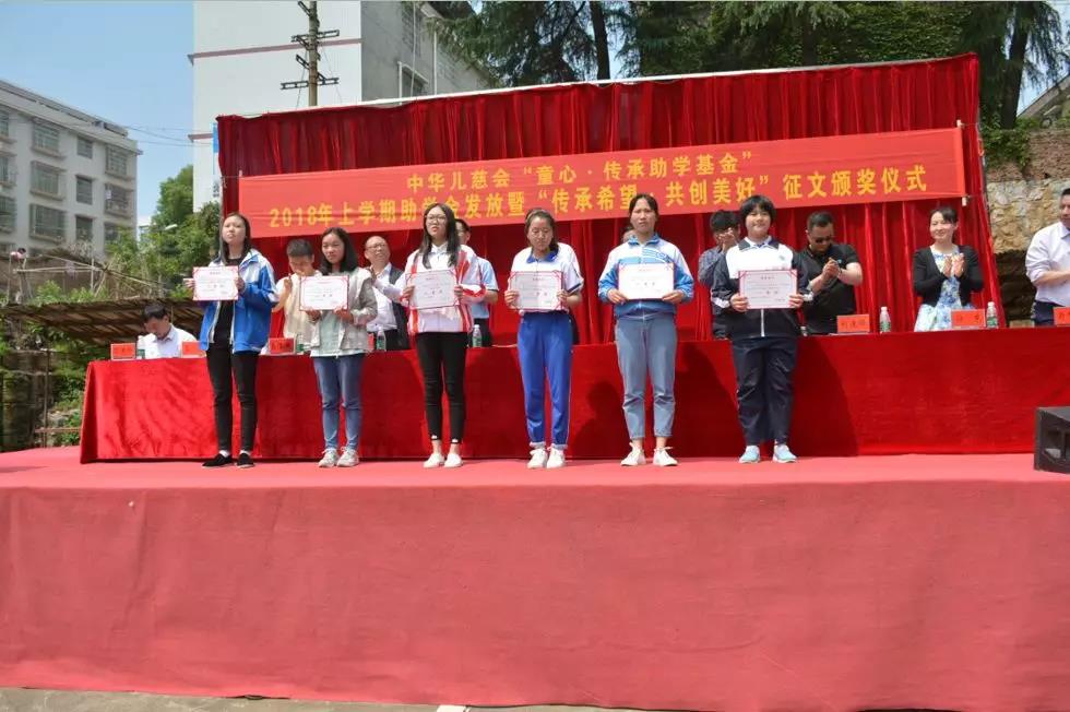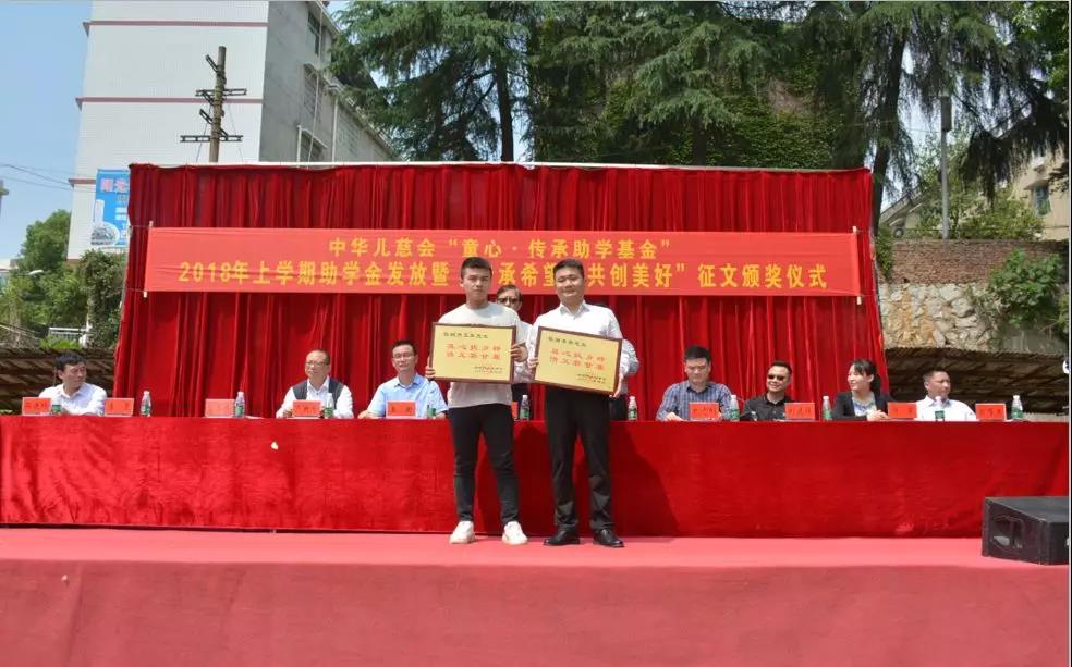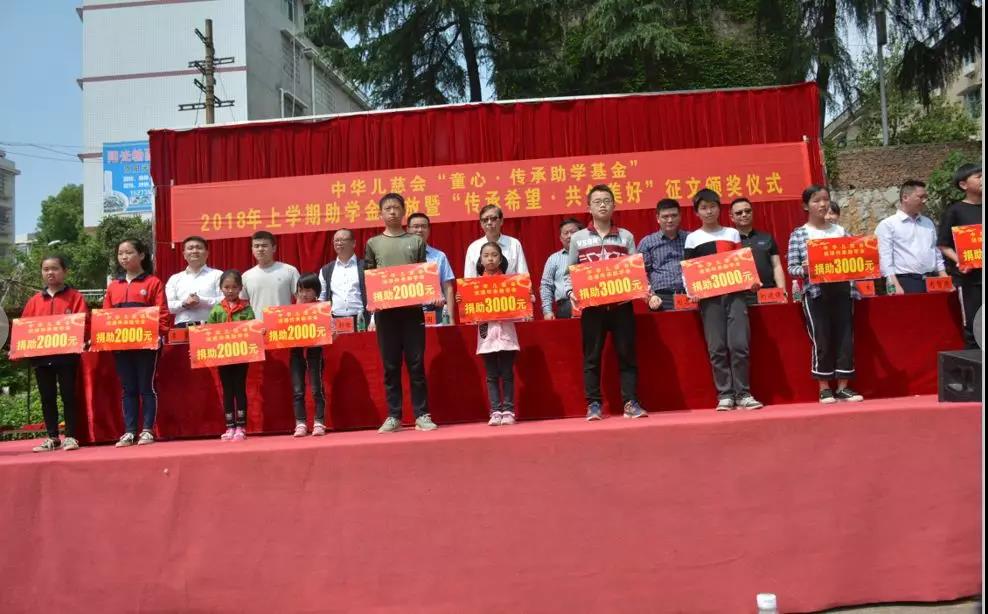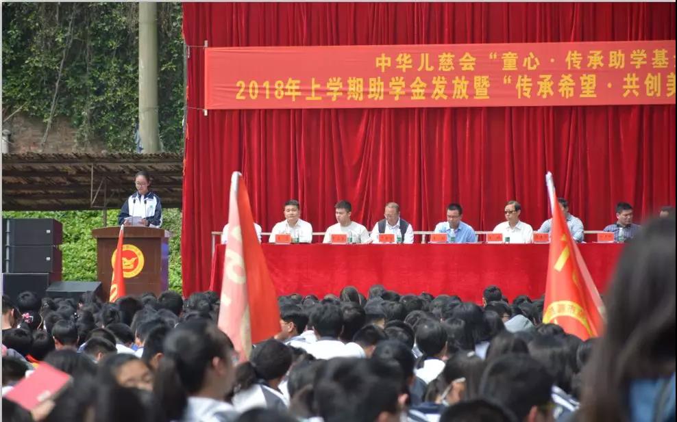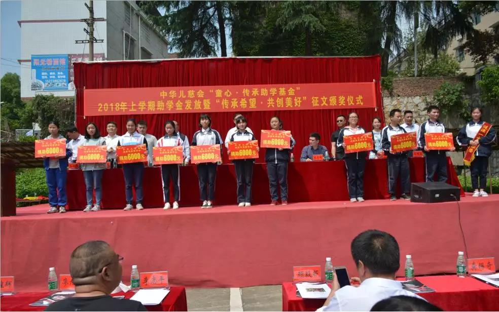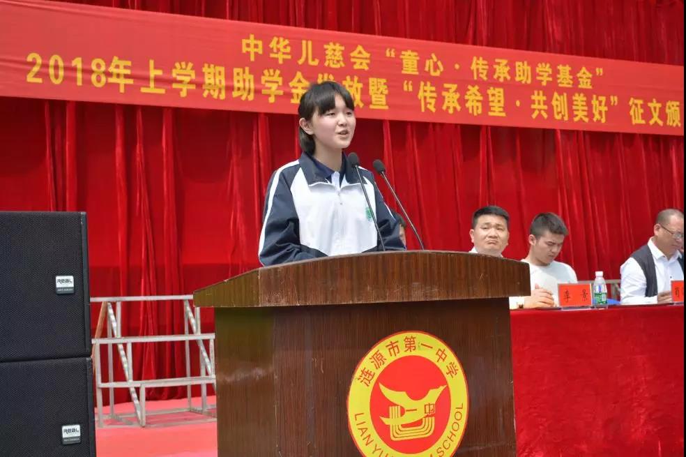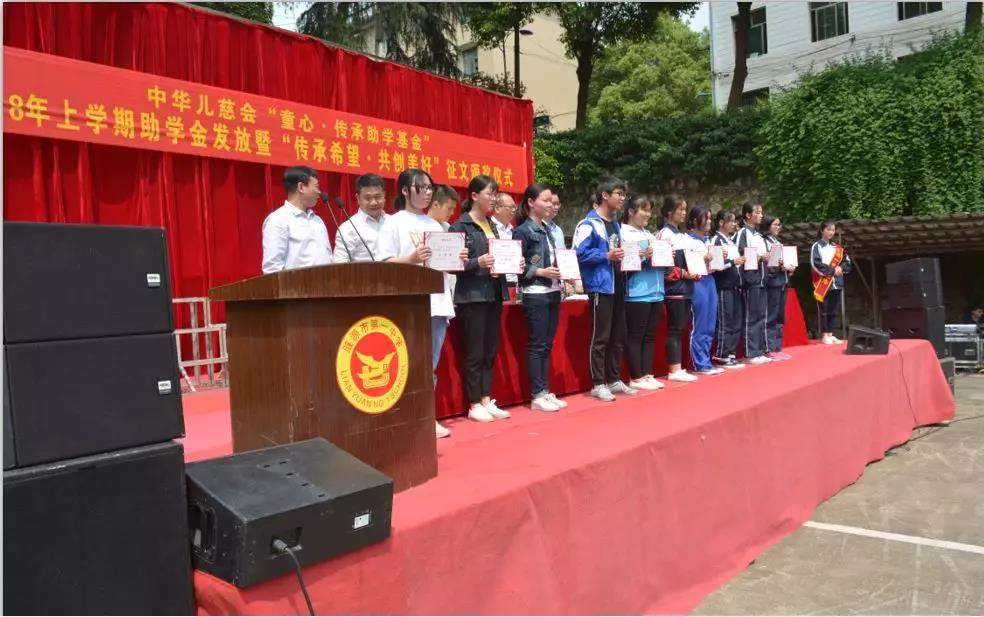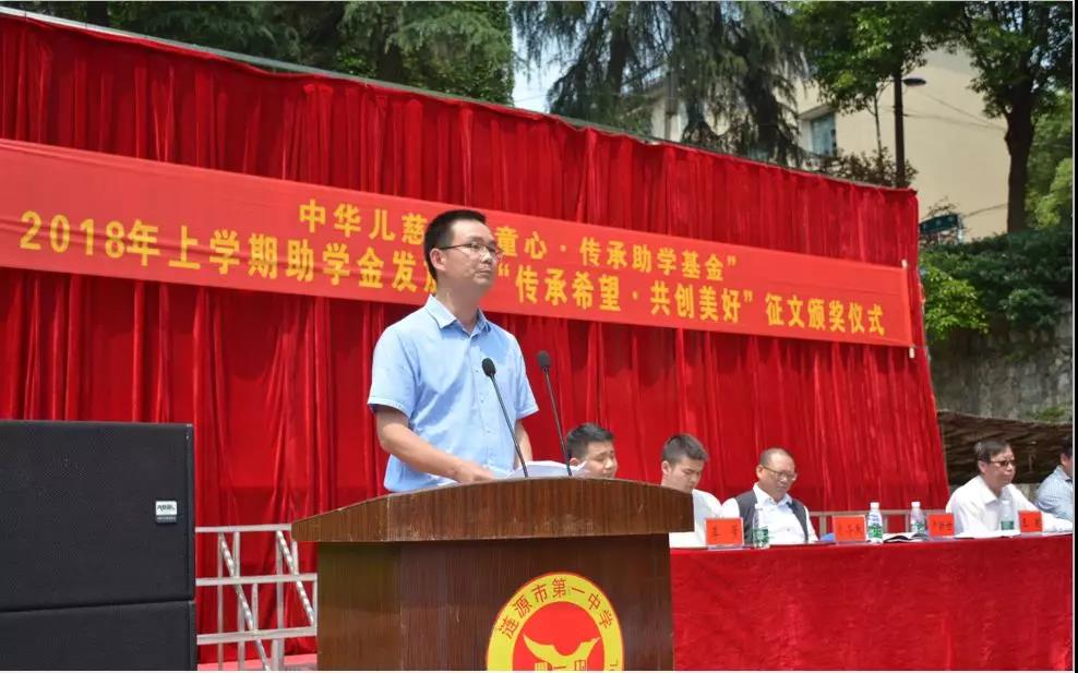 2018年4月28日上午10时,中华少年儿童慈善救助基金会、涟源传承助学会“童心·传承助学基金” 2018年助学金发放暨“传承希望,共创美好”征文颁奖仪式在涟源市第一中学隆重举行。莅临这次盛会的有:中华少年儿童慈善救助基金会理事长王林、娄底日报社长谭清华、涟源市委常委、统战部长王澍、涟源市副市长刘志刚、中华少年儿童慈善救助基金会长沙办事处主任许东、长沙涟源商会常务副会长兼涟源传承助学会会长刘建强、长沙涟源商会秘书长兼涟源传承助学会副会长卢新世、涟源市教育局局长石进科、民政局局长肖赞东、湖南湘教出版传媒集团董事长李景、湖南润和城董事长肖洛厫等领导及各界爱心人士,涟源市第一中学、涟源市第四中学、涟源市第六中学及涟源市三甲乡中心学校等十余所学校的师生代表一千多人出席了活动。