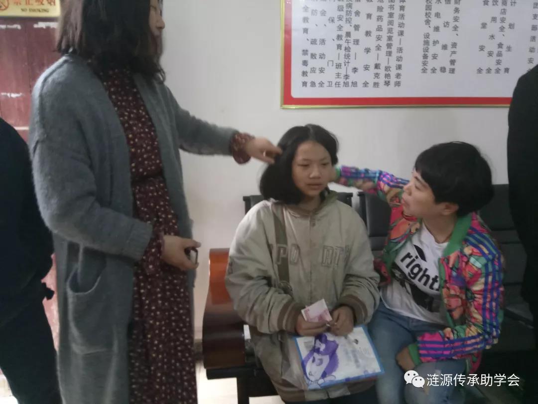 在塘湾中学,志愿者们利用课间的闲暇,与戴景鑫本人进行了交流沟通。头发蓬松凌乱的小女孩,身上穿着明显大了许多型号的脏兮兮的外套,让人一眼就能看出这是一个没有父母关心的孩子。但志愿者们还是感受出戴景鑫有了本质的变化,以前的低头驼背被昂首淡然替代了。以前无助黯淡的眼神也被明亮而坚定地目光取代了。志愿者朱琪桂,看到这样的戴景鑫非常的心疼,私人解囊掏出200元塞给她,让她去买一身自己喜欢的衣服,修一个精神一点的发型,并以一个母亲的细腻,叮嘱戴景鑫要注意仪表、仪态的修养。志愿者们还向戴景鑫赠送了励志以及学习方法的书籍,耐心地询问她现在学习遇到了哪些困难,建议她要多阅读、多做题,用勤能补拙的方法把薄弱功课赶上去,戴景鑫坚毅地点了点头,看着虽然个子矮小但却步履从容坚定地走回教室的小女孩,志愿者们的眼中也浮现出欣慰的笑容.