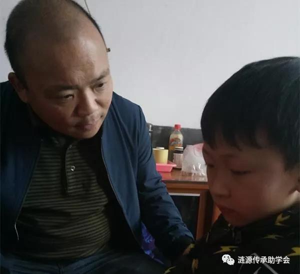 在龙淼的家中,志愿者们向龙淼父亲发放了本学期的助学金,并就龙淼的成长与他进行了详细交谈,叮嘱他一定要关注孩子的心态的成长。
