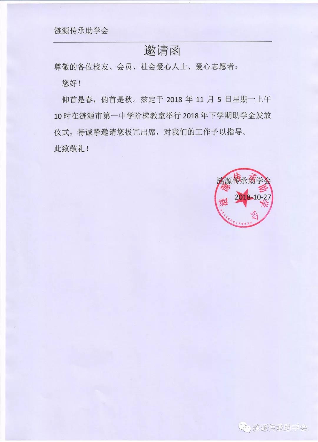 尊敬的各位校友、会员、社会爱心人士、爱心志愿者: 您好! 仰首是春,俯首是秋。兹定于2018年11月5日星期一上午10时在涟源市第一中学阶梯教室举行2018年下学期助学金发放仪式,特诚挚邀请您拔冗出席,对我们的工作予以指导。