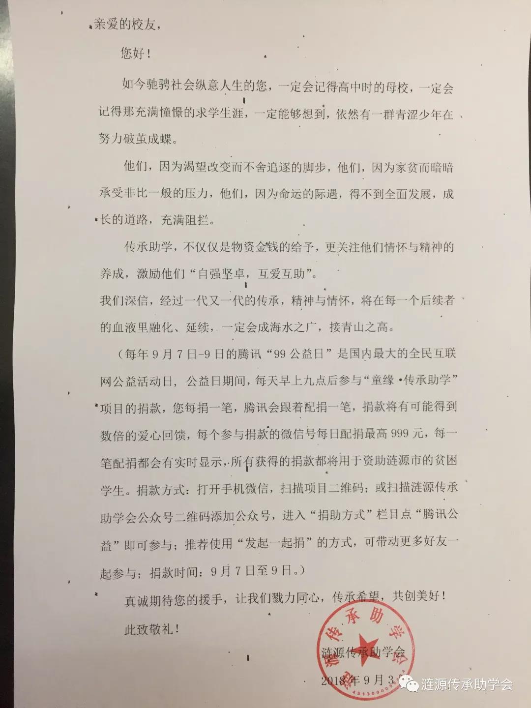 (每年9月7日-9日的腾讯“99公益日”是国内最大的全民互联网公益活动日,公益日期间,每天早上九点后参与“童缘·传承助学”项目的捐款,您每捐一笔,腾讯会跟着配捐一笔,捐款将有可能得到数倍的爱心回馈,每个参与捐款的微信号每日配捐最高999元,每一笔配捐都会有实时显示,所有获得的捐款都将用于资助涟源市的贫困学生。捐款方式:打开手机微信,扫描项目二维码;或扫描涟源传承助学会公众号二维码添加公众号,进入“捐助方式”栏目点“腾讯公益”即可参与;推荐使用“发起一起捐”的方式,可带动更多好友一起参与;捐款时间:9月7日至9日。)