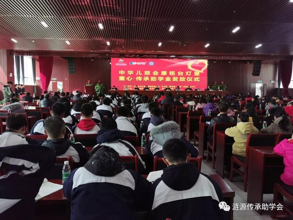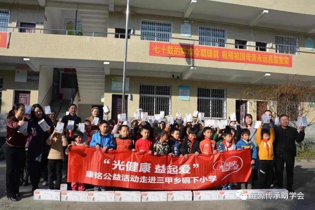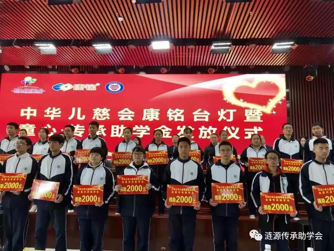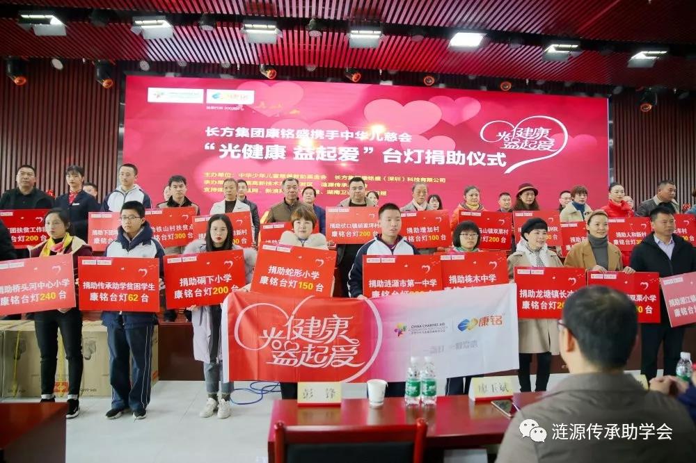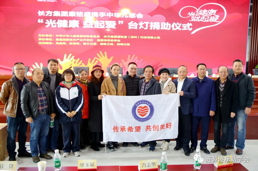 2019年12月3日,中华少年儿童慈善救助基金会康铭台灯捐赠暨童心•传承助学金发放仪式在娄底高新区涟商总部隆重举行。活动由中华儿慈会与深圳长方集团联合主办,娄底高新区与涟源传承助学会共同承办。现场,中华儿慈会共捐赠涟源市多所学校及多个扶贫点台灯5262支,价值18.8万元,该批台灯全部由深圳长方集团爱心赞助,深圳长方集团创始人李迪初系涟源籍人士,一直心系桑梓,关爱家乡。同时,涟源传承助学会发放89名优秀贫困学生2019年下学期童心•传承助学金19.8万元。童心•传承助学基金由中华儿慈会与涟源传承助学会合作创立,旨在“传承希望,共创美好。”