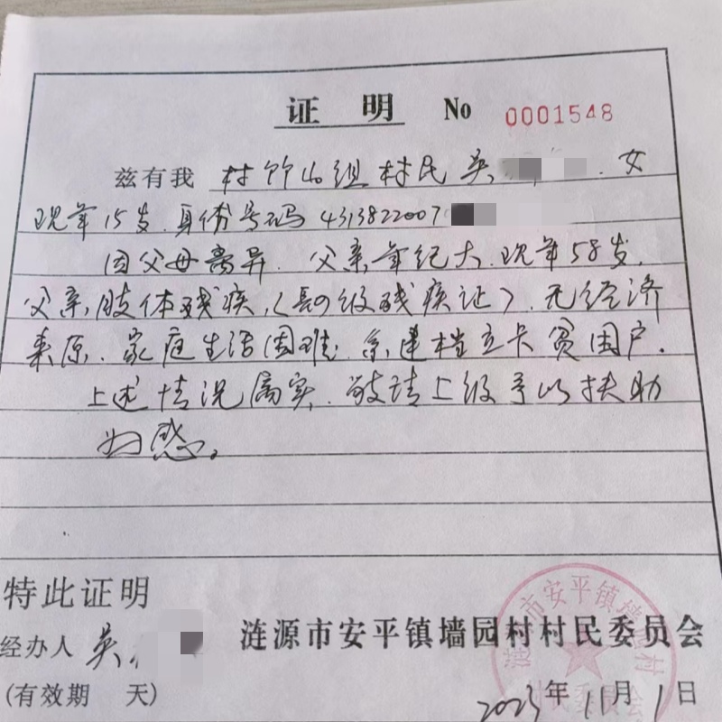家庭概况:学生父亲离异,父亲年纪偏大(接近花甲),无任何技术,肢体四级残疾,很难找到工作,基本上没什么收入。祖父年事已高,对家庭没有支持。家中住房为扶贫帮助所建。